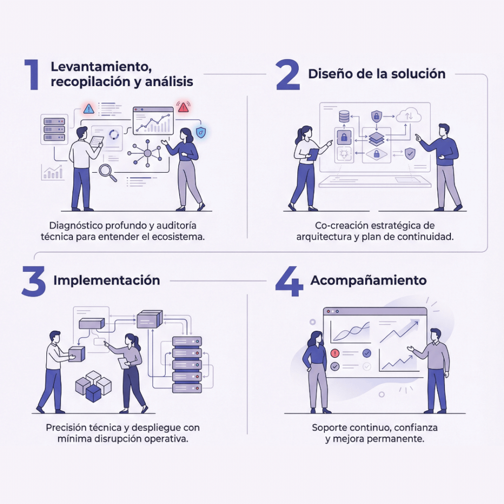 Realizamos la ejecución técnica con mínima interrupción del servicio. Documentamos cada paso y transferimos el conocimiento necesario al equipo del cliente para una adopción fluida.